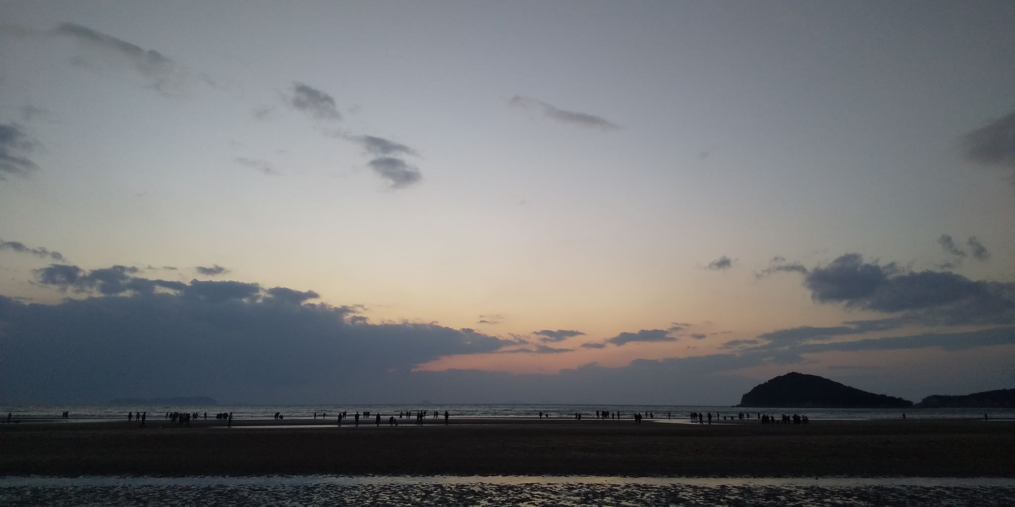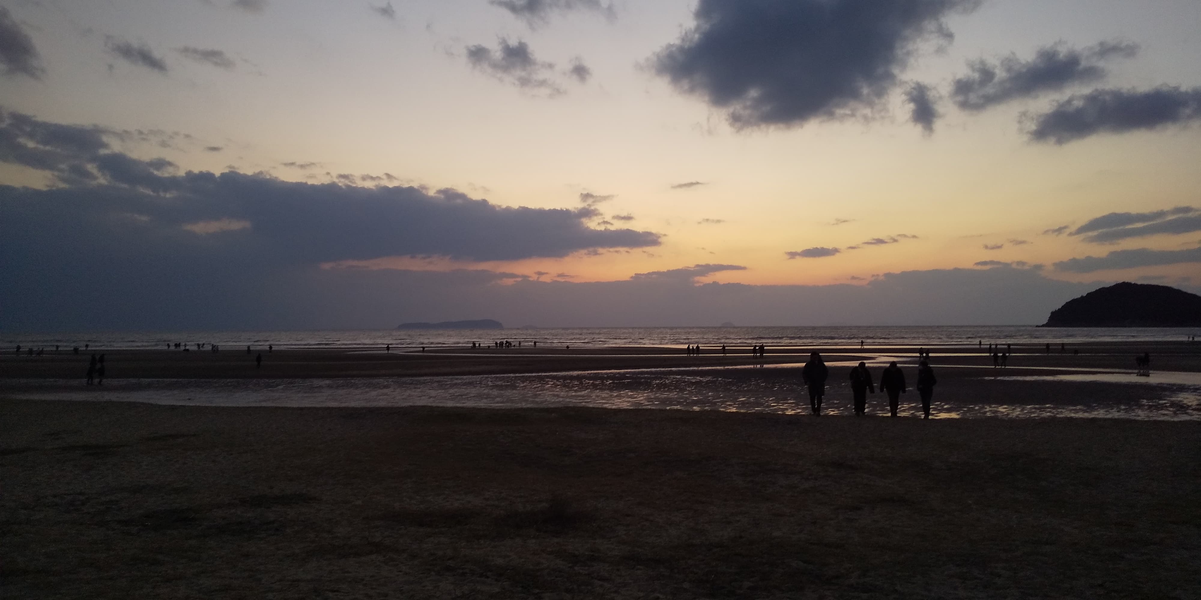 残念ながら今日は風が強く、波が立ってうまく反射しなかったようですが、三豊市役所によると、・日の入りと干潮の時刻が近い時、・風の無い晴れの日、・日の入り前後30分、という条件で絶景が撮影できるとか。